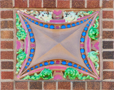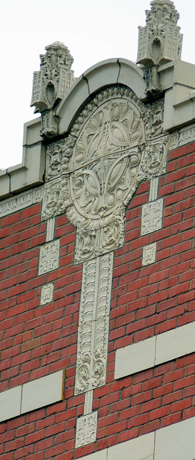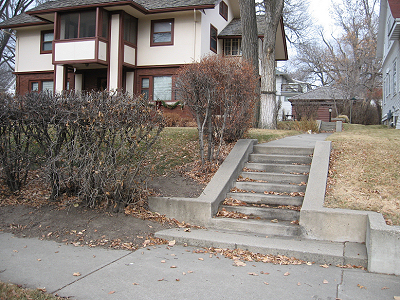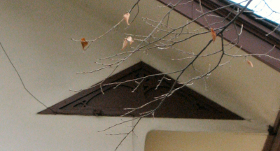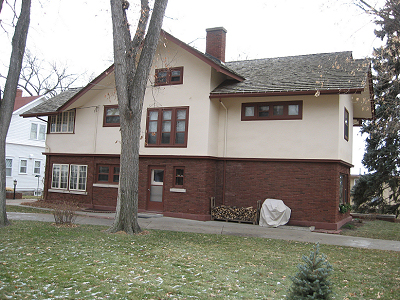 | We start with eight images taken earlier this year by Richard Kronick of the Patrick E. Byrne residence (Bismarck, North Dakota 1909). This is the very first commission to carry the Purcell, Feick, & Elmslie title block. Prior to these shots, I had not seen a color view. One sweet discovery is the delicate tracery of sawed wood found in a triangular decorative sawed wood panel tucked up beneath the eave. Given there was funding of this tidbit on the exterior, I can only hope one day for funding for me to get to a place so far off my personal trail as Bismarck to see what's left inside. The Byrne house and the Louis Heitman residence in Helena, Montana, seem sometimes like they might as well be on Mars for the likelihood of my feet ever getting there. | ![]() Photograph by Richard Kronick, 2007 |