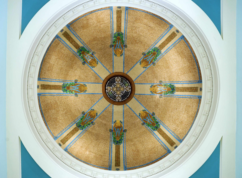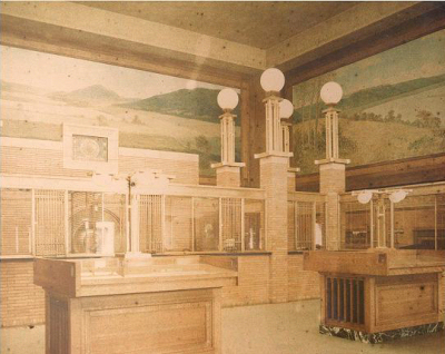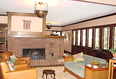 ![]() Living room, 2007 Oscar Owre residence Purcell, Feick, and Elmslie Minneapolis, Minnesota 1911 Somewhere underneath that paint above the fireplace there may still remain a mural painting by Charles S. Chapman. The Owres never liked it, apparently, and it was soon painted over. Additional coats since may have actually preserved the work. Cotton swab, anyone? |